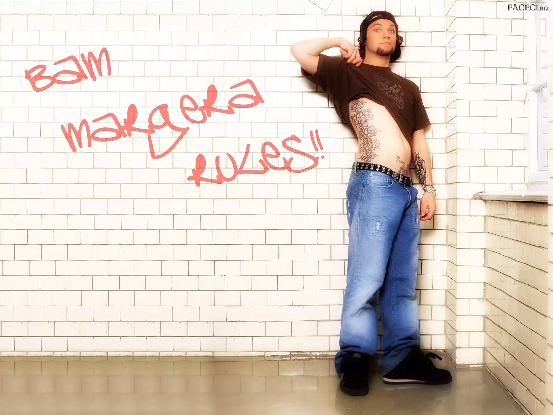 kurtka, Bam Margera, rozpięta włosy, Bam Margera, ciemne zegarek, Bam Margera, deskorolka okulary, Bam Margera, butelka okulary, Bam Margera, twarze t-shirt, Bam Margera, brązowy